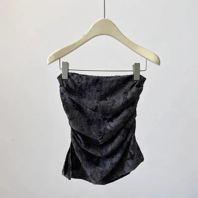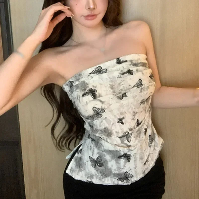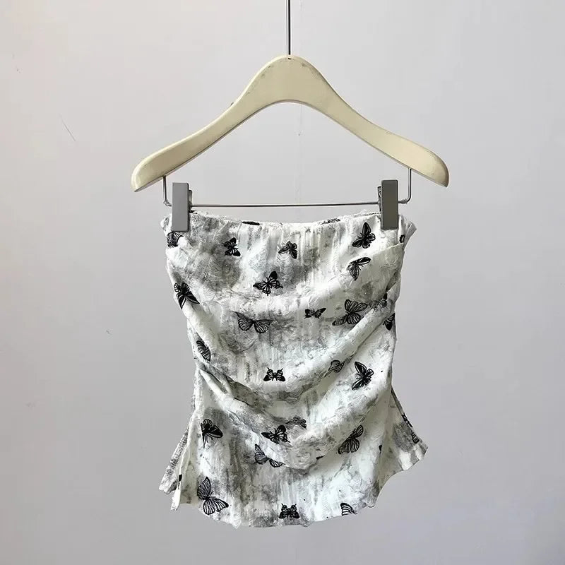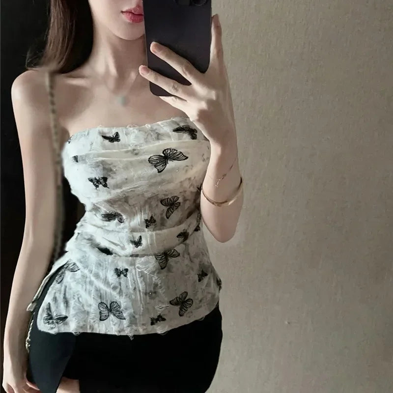 Elegant Summer Women's Butterfly Print Pleated Camisole with Irregular Wipe Slim Sexy Spice Short Top in French Style