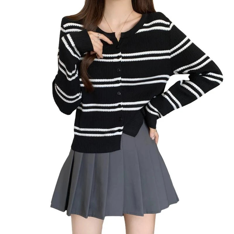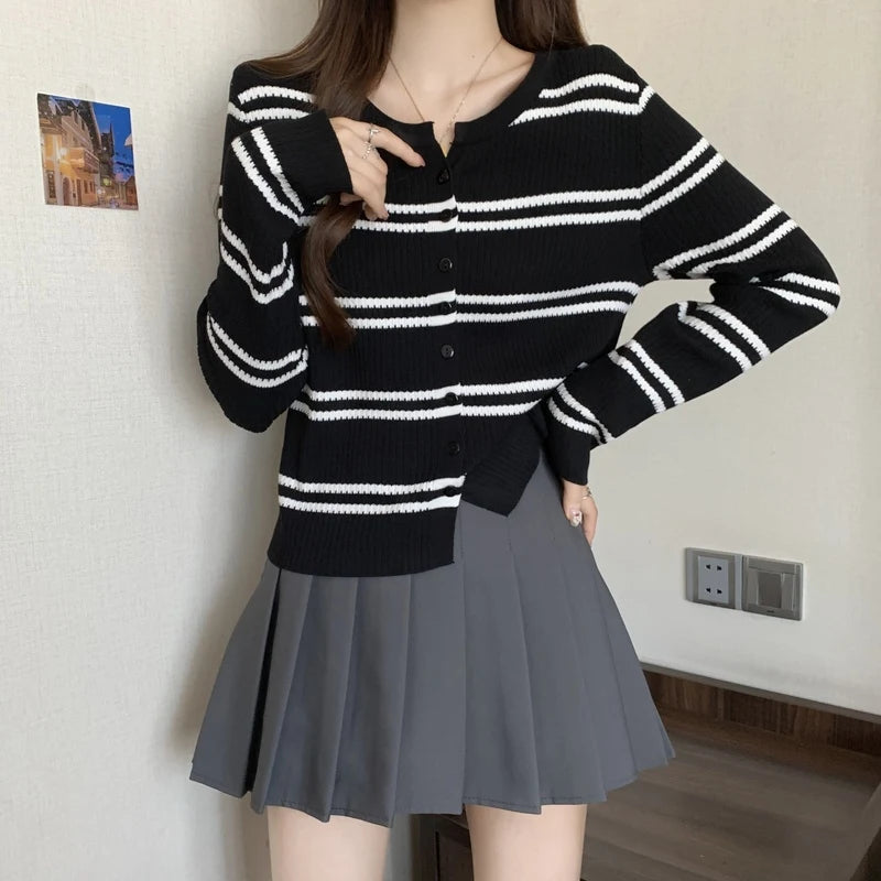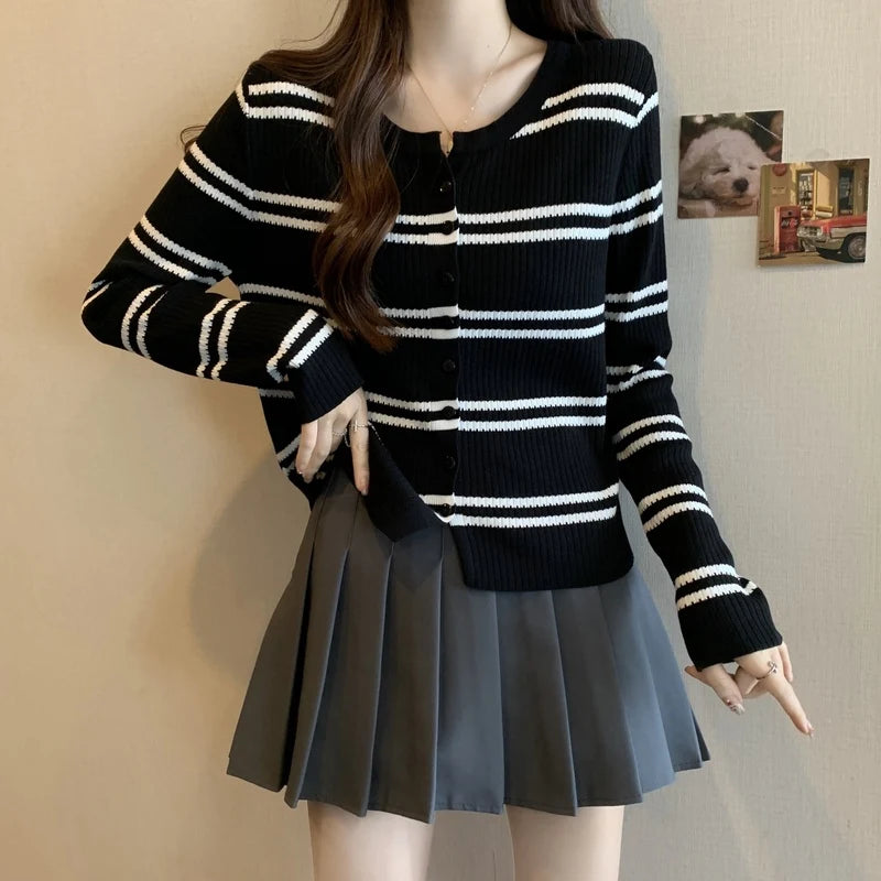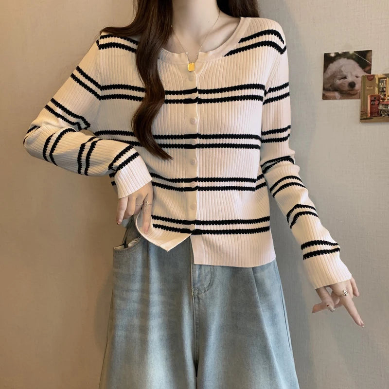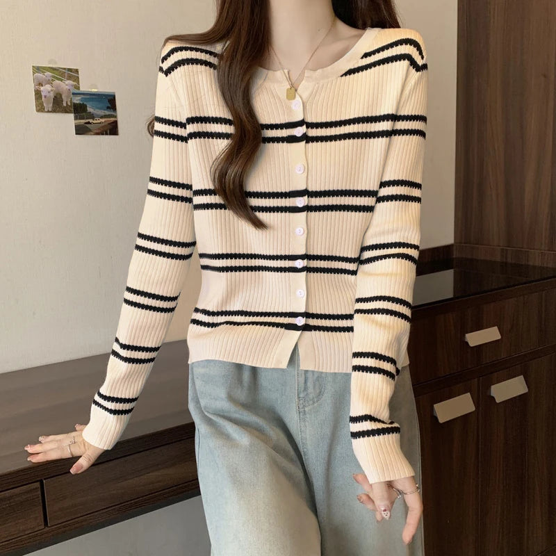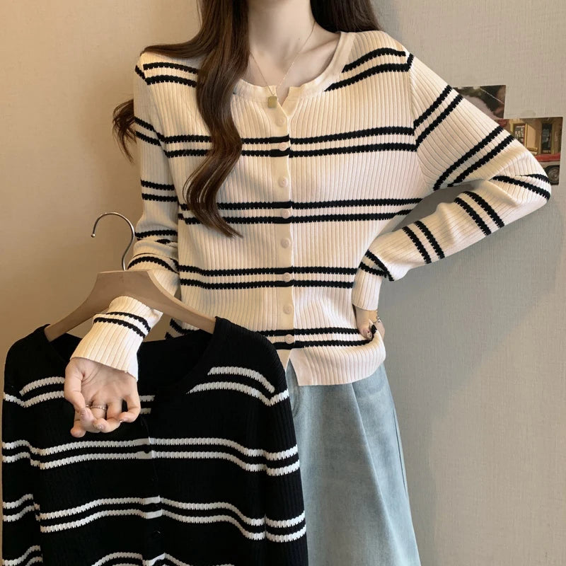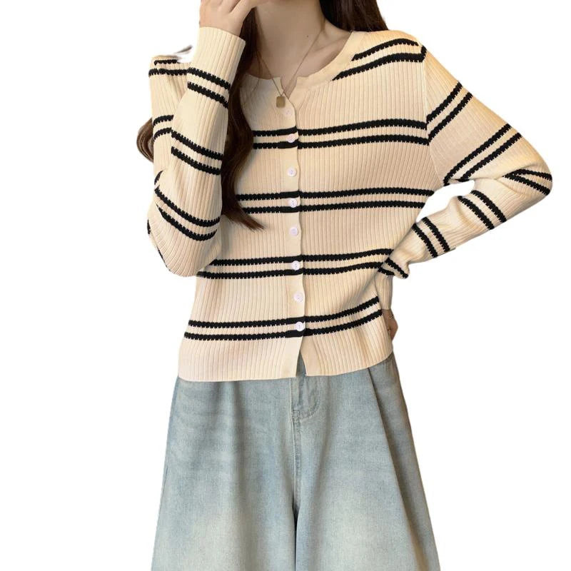 Women Cardigan Spring Autumn Round Neck Striped Casual Fashion Versatile Knitted Cropped Sweater
