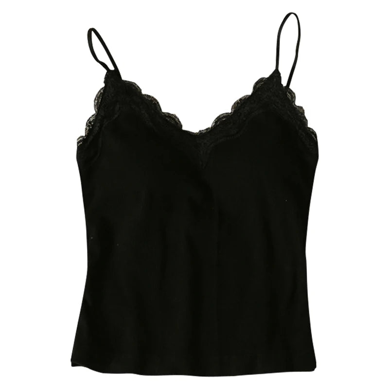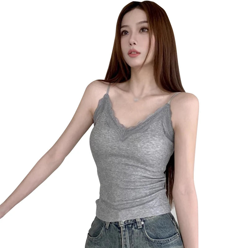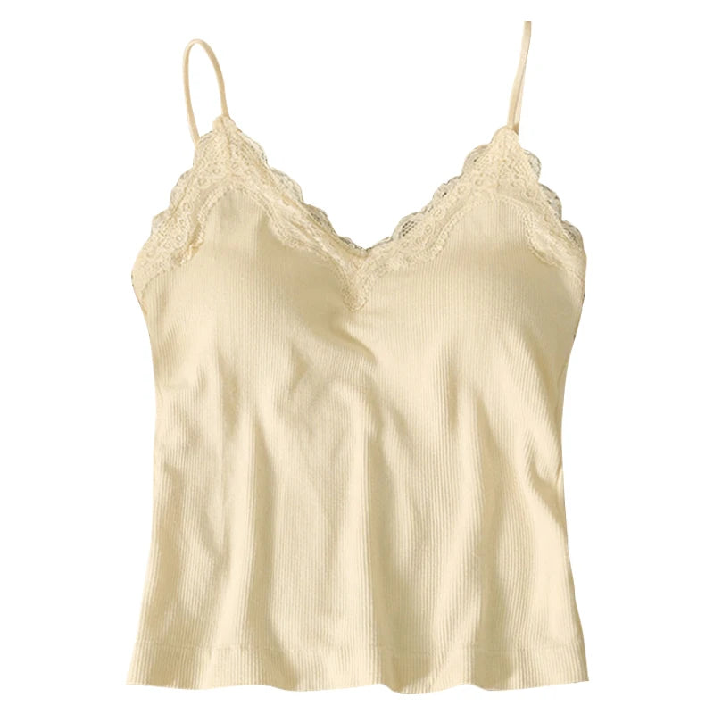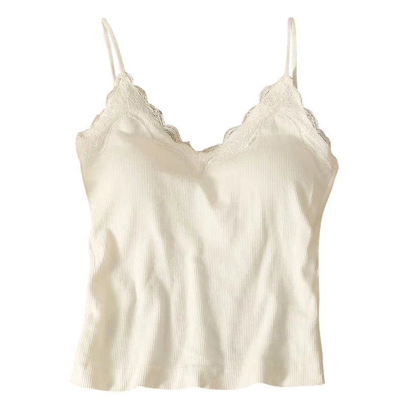 Women Sleeveless Tank Tops Solid Color Korean Version V Neck Slim Fashion Lace Stitching With Chest Pad Camisole