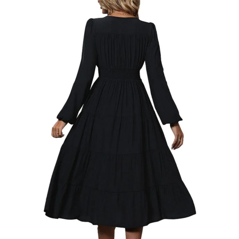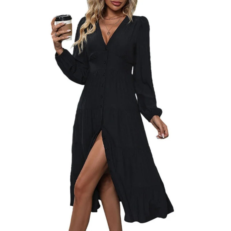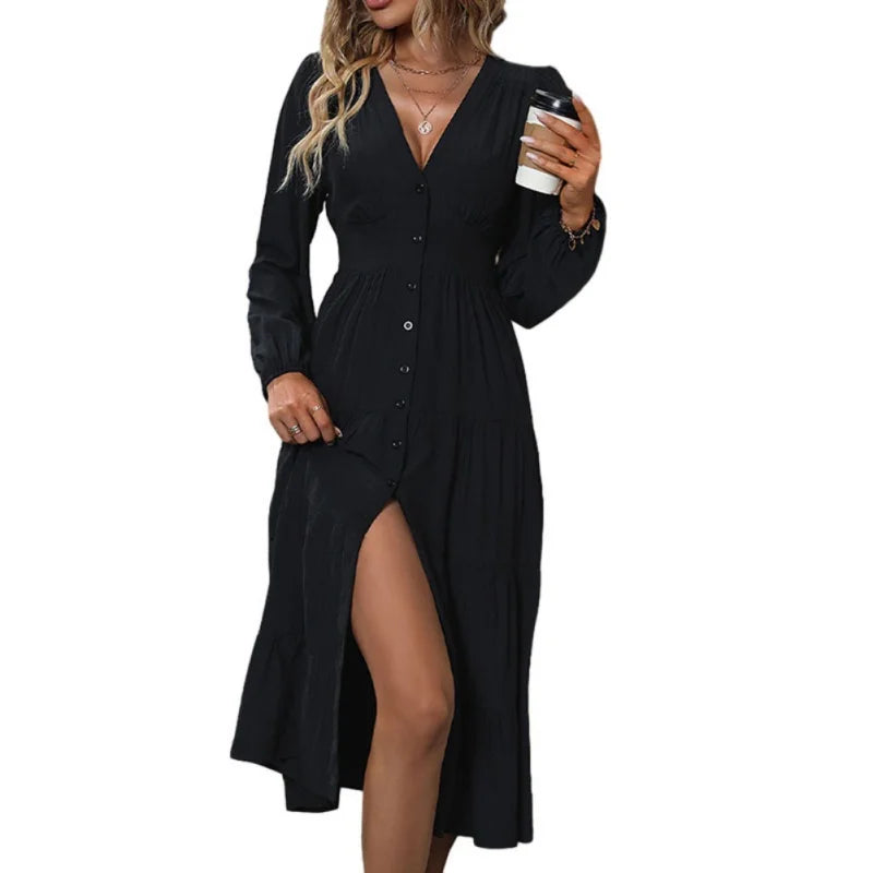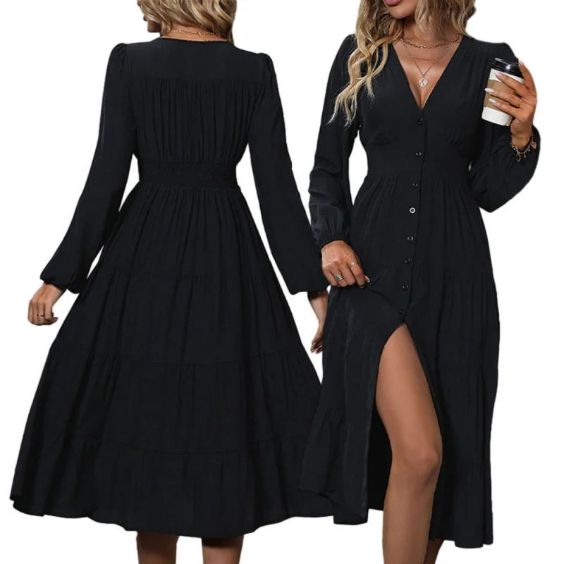 Women's Midi Dress Autumn Long Sleeve Button Casual Loose V-neck