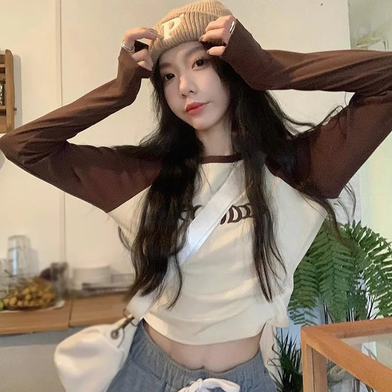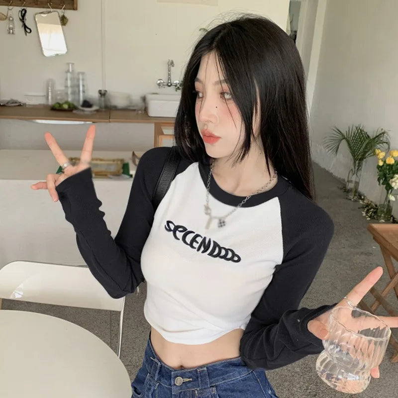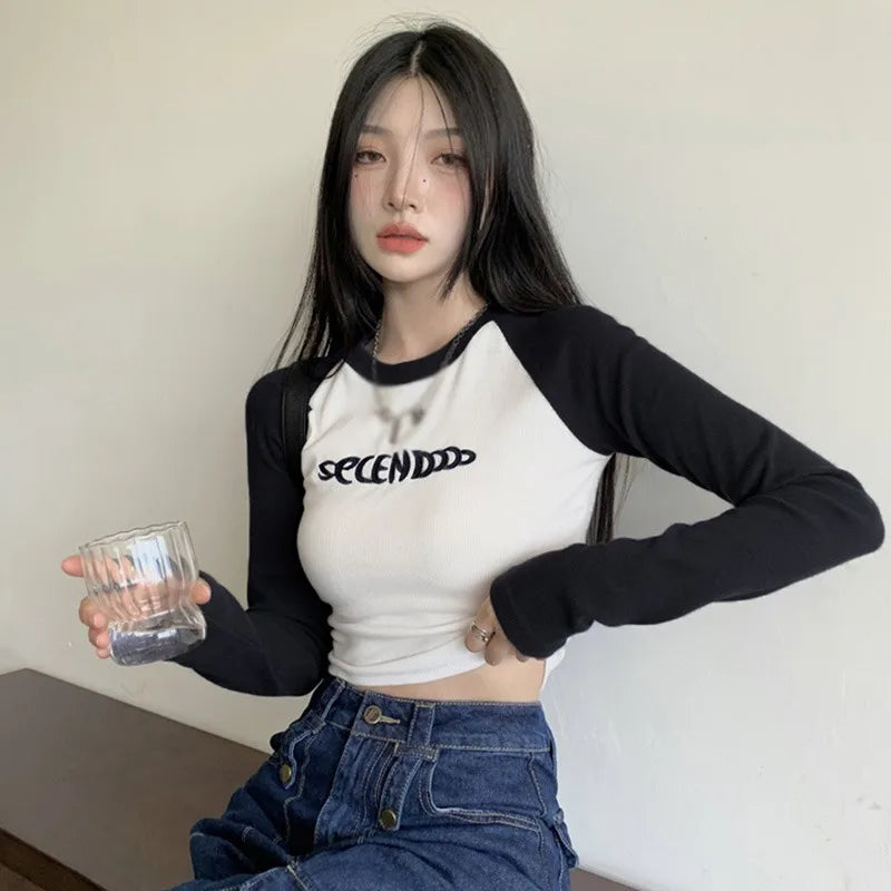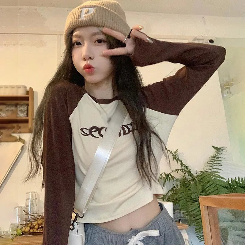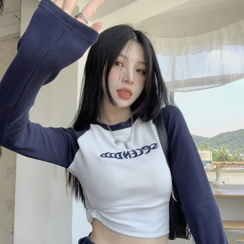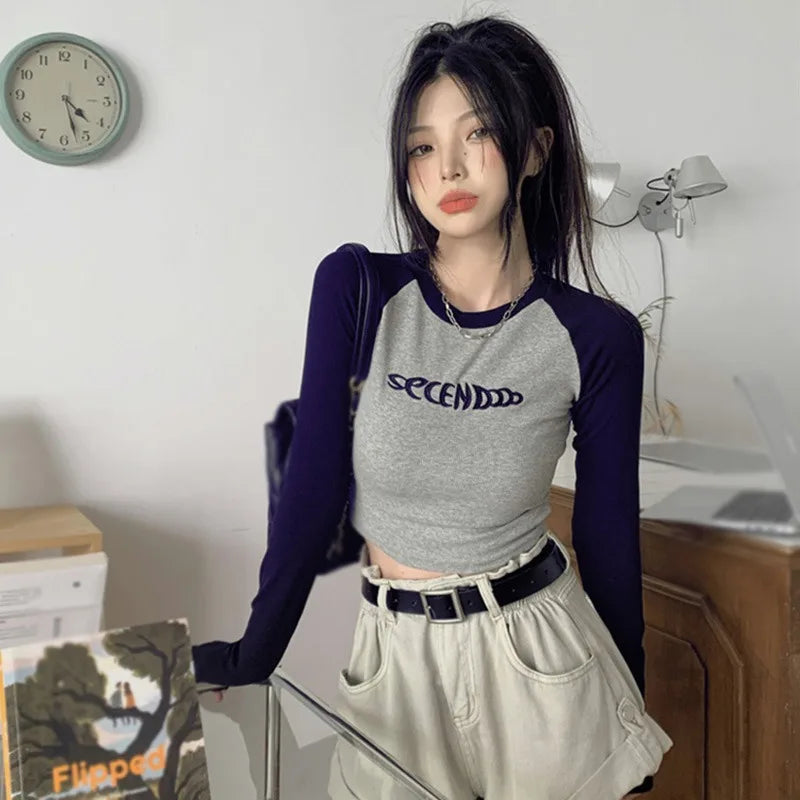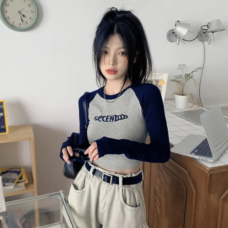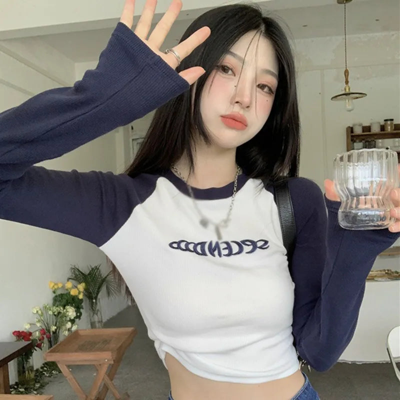 Women's Tops Korean T-Shirts Tight Cropped Inner Layer Slim Fit Contrast Color Long Sleeves Crew Neck